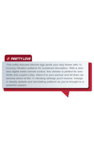 Ова нежно силиконско јајце има 10 различни модови на вибрација и секој од тие модови има по 9 брзини на вибрација, кој што може да се контролираат преку далечинскиот управувач со LCD екран или ако сакате може да го контролирате со притискање на копчето што се наоѓа на самото јајце.